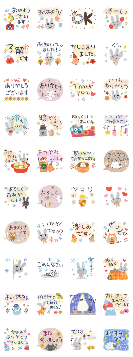 暖かい色でほんわか。毎日使える敬語スタンプです。 クリスマス、お正月にも。ひらりーーの大人の気遣いシリーズ16。 うさぎ/ふくろう/猫/ハリネズミ/挨拶/人気