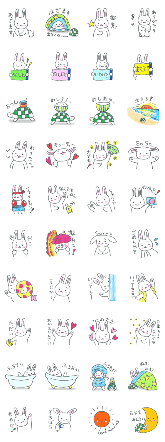 日常で気軽に使えるかわいいうさぎとかめのスタンプです。(関西弁だったり、なかったり) 学生さんが使いやすいかも?!