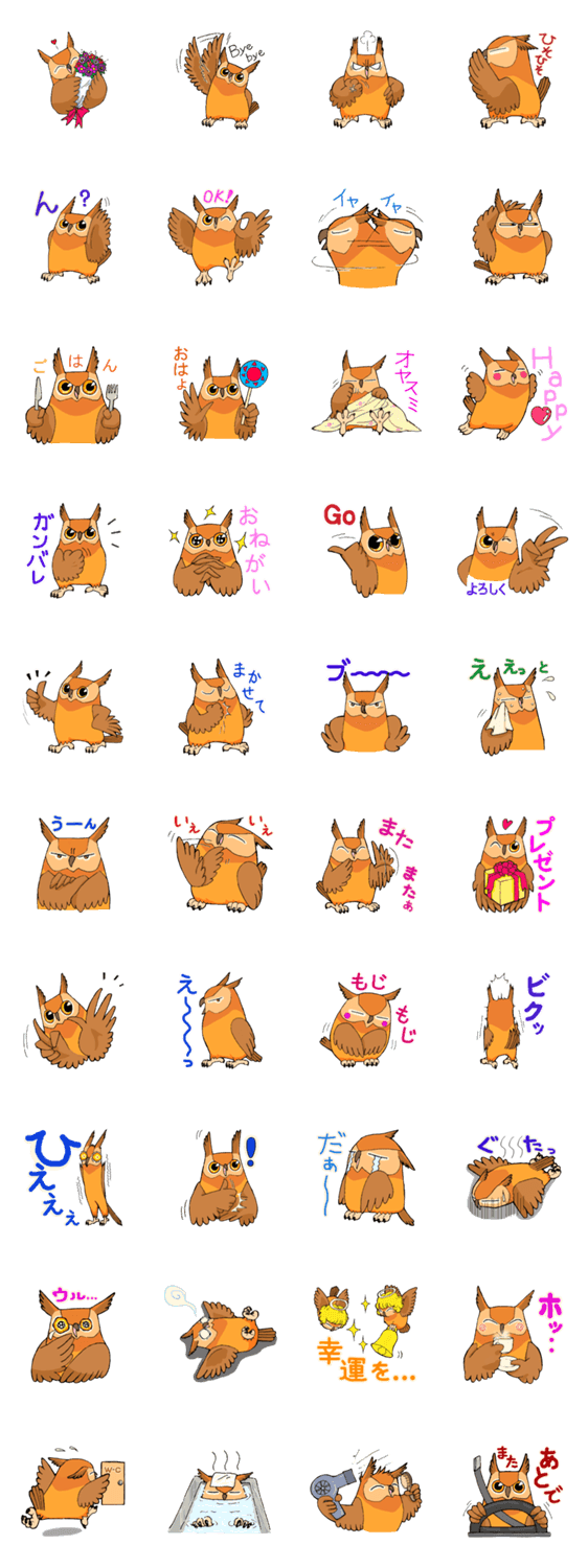 かわいいミミズクさんが、基本的な日常会話やコミュニケーションを表現しています。手書きの味は出ていると思います。