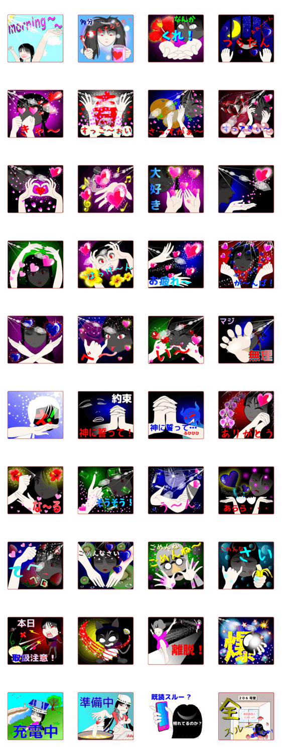 | スタンプ説明 | キラキラでうざいはずがなぜか癒される、そんな要素を盛り込み、潜在意識に存在感を焼き付ける対異性用インパクト型スタンプです。 |