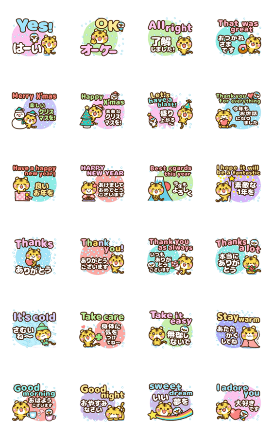 トラちゃんが初登場♪ 雪降る寒い冬の日常、年末年始に幅広く使る[敬語]の英和Ver.スタンプです♫ 国内外のお友達や家族とバイリンガルに会話をお楽しみください♬