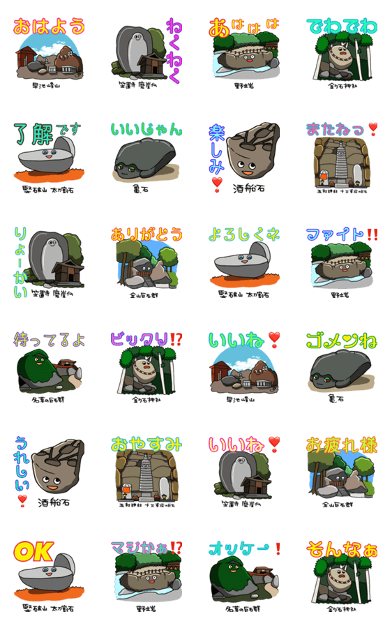 スタンプ説明 遊びに行こう!キャラクターが巨石の形