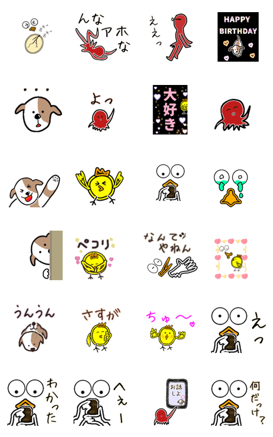 Junjun絵文字、エフェクト、きせかえに続きポップアップスタンプ版です。新しいワンワンが増えました。鳥はお茶を飲むと話を聞きません。仲の良い人に使って下さい。