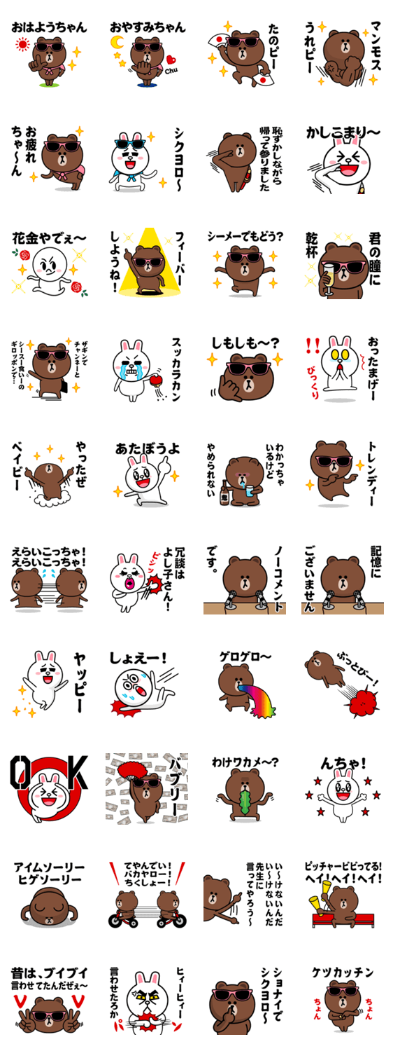| スタンプ説明 | ブラウン/コニー/LINEキャラクターズ/昭和/死語/平成/ダジャレ/オヤジギャク/80年代/テレビ/黄金時代/バブル/プロデューサー/流行語/流行り/ナウい/毎日使える/日常会話 ※BROWN & FRIENDS をみんなでつくろう!キャンペーン参加スタンプです |