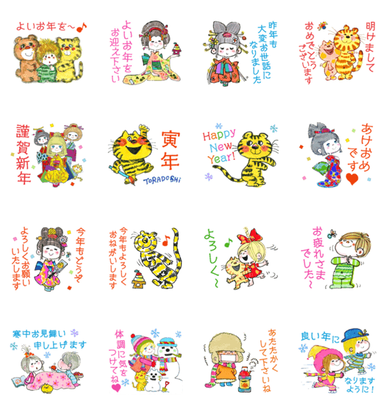 亜土ちゃんの寅年お正月スタンプが登場だよ♪お世話になった方へのご挨拶や新年のはじまりにぴったりのスタンプです。