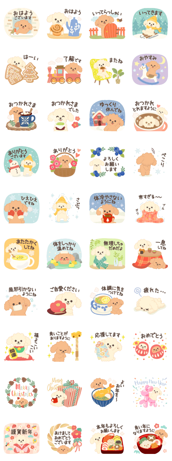 甘さ控えめ大人かわいいふわもこのトイプードル♪毎日のあいさつに使えるシンプルな犬スタンプ。冬の気づかい言葉から敬語・挨拶・お仕事にも。クリスマス、年末年始あり。