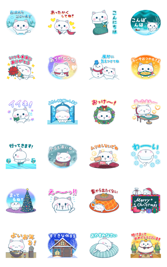 雪のような白猫さんのアニメーションスタンプです。クリスマスとお正月は雪猫さんといっしょに過ごしましょう。