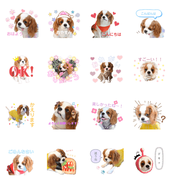 ペロと困り顔がチャームポイントの犬!キャバリアのめるのスタンプです。日常で使える言葉で制作しました。