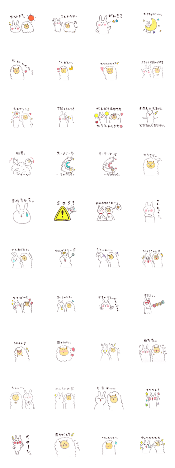 日常的な会話で使える、ゆるーい感じのうさぎさんとひつじさんです。うさぎさんソロ、ひつじさんソロもあります♡お気に入りのスタンプをぜひ見つけてみてください!