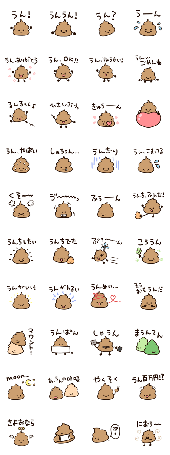 かわいいうんち、うんこ好きな方へのネタスタンプです。返信に困ったときや、話題作り、煽りにもどうぞ。日常会話にも毎日使えるセットです。