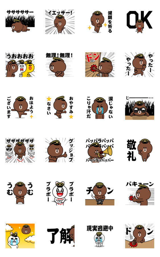 | スタンプ説明 | ブラウン/コニー/ムーン/サリー/LINEキャラクターズ/毎日使える/日常会話/挨拶/軍人/軍隊/自衛隊/陸軍/海軍/空軍/サバゲー/エージェント/ミリタリー/アーミー/軍曹/大佐 ※BROWN & FRIENDS をみんなでつくろう!キャンペーン参加スタンプです |