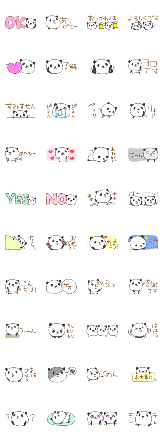 | スタンプ説明 | 毎日使える、省スペースサイズのパンダのスタンプ。シンプルな会話、挨拶、お礼や気持ちを簡単に伝えるぱんだのスタンプ。 |