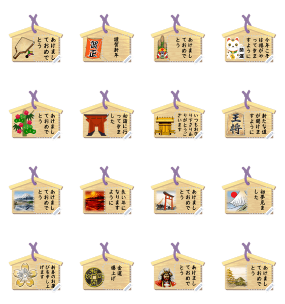 日本の神社にある願い事を書く木札です。新年早々伝えたいことを書いて願えば叶うかも? 現在この商品は一部のスマートフォン版LINE 10.3.0以上のトークルームでのみ使用できます。動作環境の最新情報はヘルプをご確認ください。