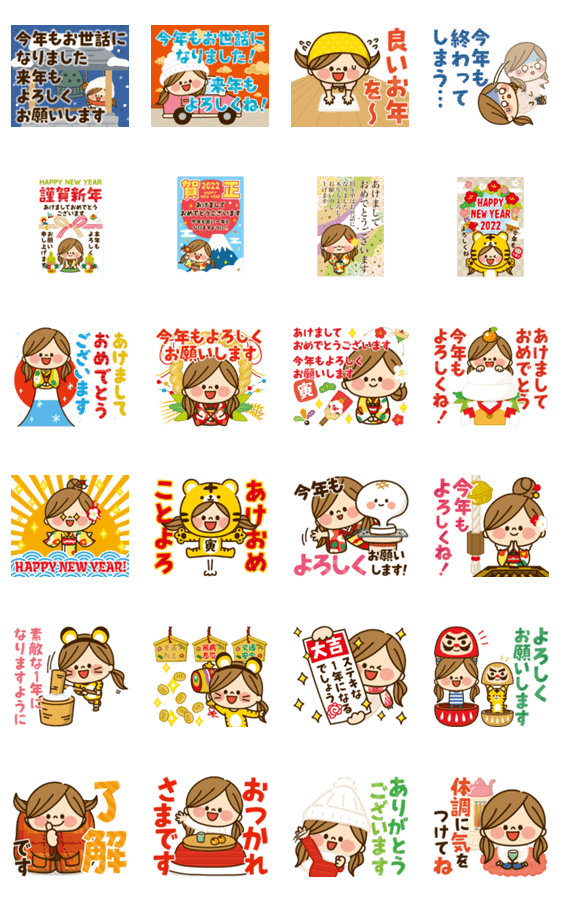 2022年末年始にぴったりな飛び出すポップアップスタンプです。かわいい女の子のお正月、年賀など冬にたくさん使える楽しいスタンプです。新年の挨拶にぜひお使いください!