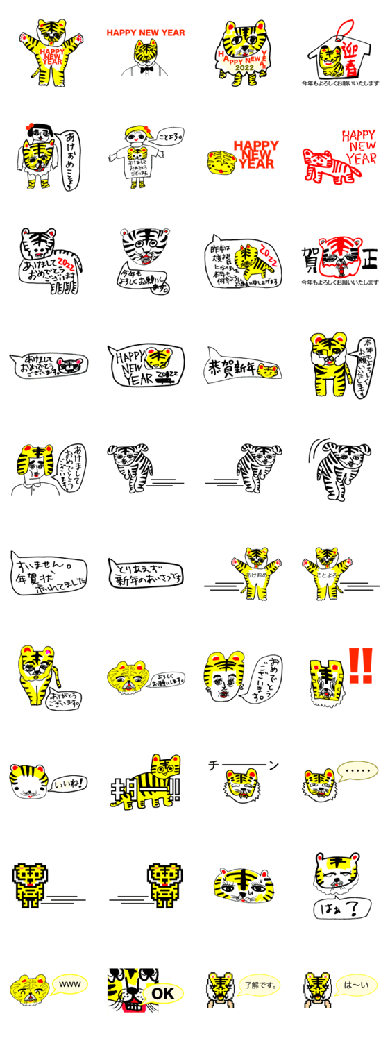 トラ(とら・虎・寅・タイガー)さんのラクガキスタンプです。2022年の干支(十二支)は寅(寅年)なので年末年始・お正月で使えます。油山のトラ。「あけおめ」「ことよろ」