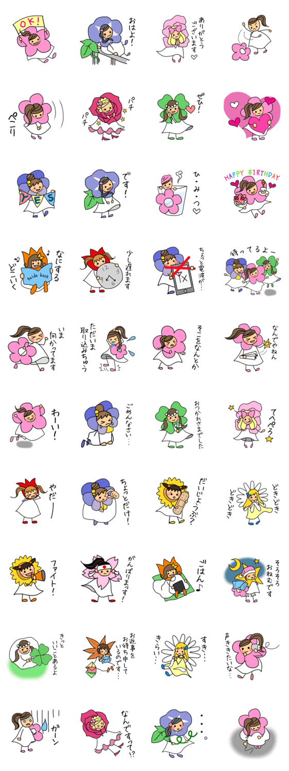 ちいさなお花の妖精・おはなちゃんのスタンプです。あさがおさんもローズ姫もすみれ先輩も、みんなおともだち。あなたの日常をおはなちゃんたちでいっぱいにしてください☆