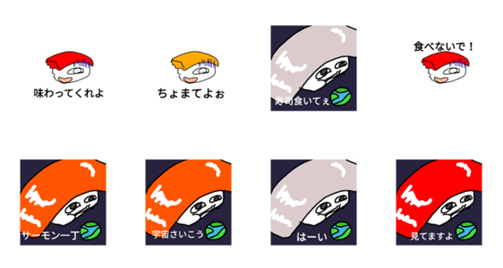 | スタンプ説明 | おすしですしぃスタンプその3です。まだまだ無名です。お寿司のスタンプです。 |