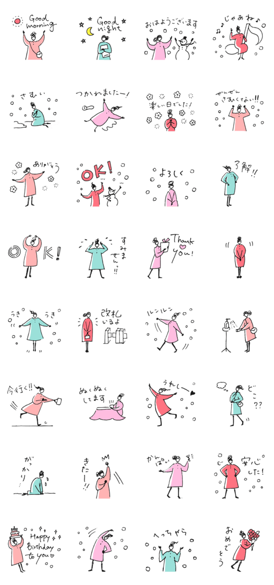 冬のシンプル日常スタンプ。友達のお誕生日やいつものあいさつ、お出かけ先で、大人も女子も毎日使えるかわいい基本セット。