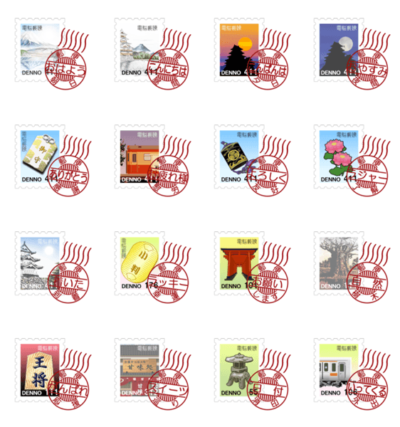 神社、富士山、お城、鉄道など様々な絵柄の切手を作りました。消印を押してあります。