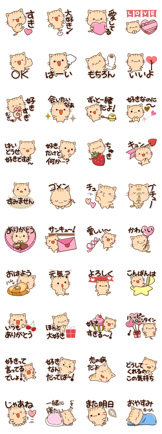 『ちびトラ』の、ちいさな虎猫スタンプから、恋人、夫婦、バレンタイン等、好きな人に思いを伝える、ねこスタンプです。かわいいとらネコが気持ちを代弁します。【かたこ】