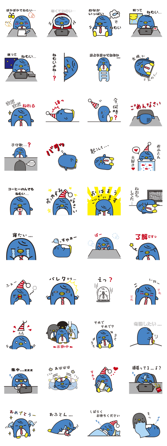 | スタンプ説明 | サンリオキャラリーマン総選挙エントリーナンバー19。眠気を我慢しながら毎日頑張っているペンギンです。 |