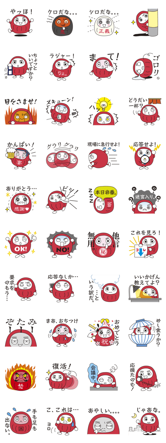 | スタンプ説明 | サンリオキャラリーマン総選挙エントリーナンバー13。正義を愛するだるまの刑事、空回りすることも多いけどいつも全力疾走!転んでも何度でも起き上がります! |