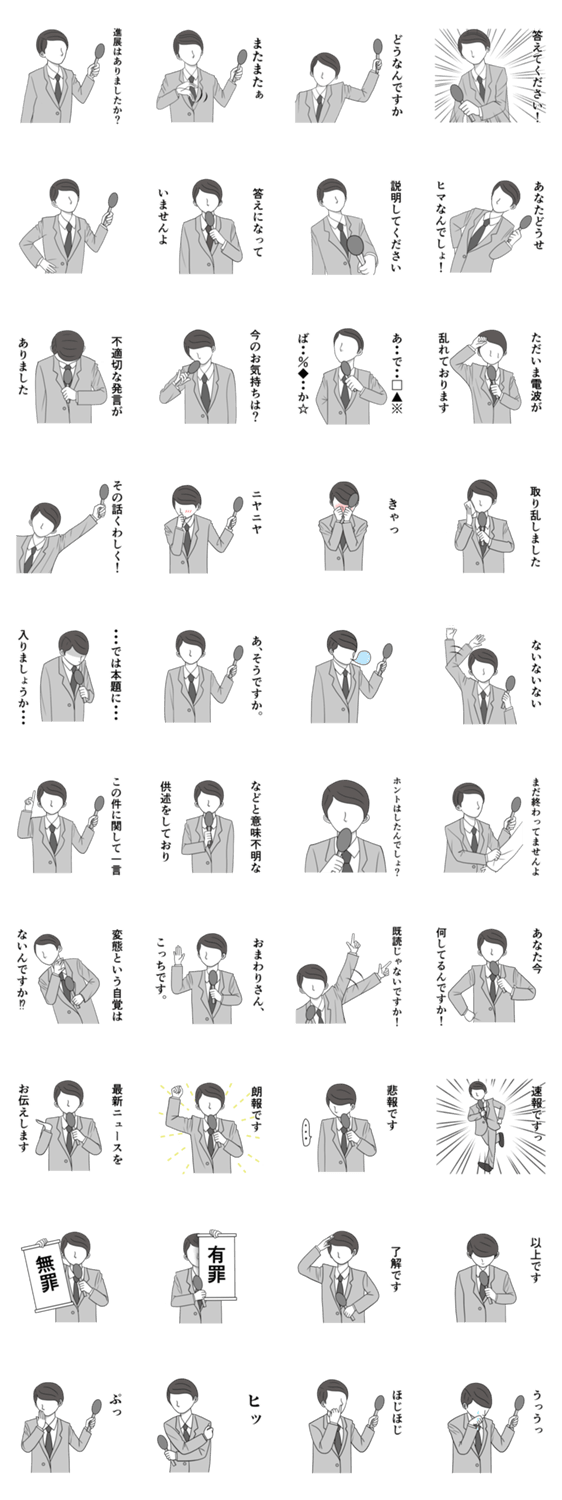 リポーター・記者が質問したりつっこみを入れたりするスタンプです。
