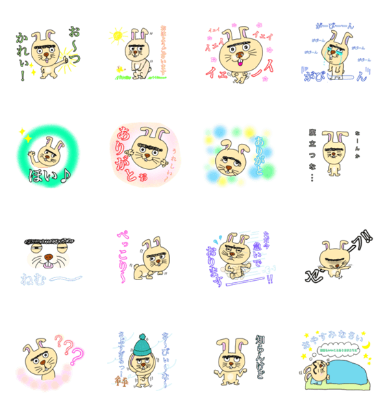 日々の中で使われていそうなワードを集めました。気心知れた人に軽く送れるスタンプです。おっちょこちょいなうさぎがちょっと調子乗っちゃってる顔がポイントです。