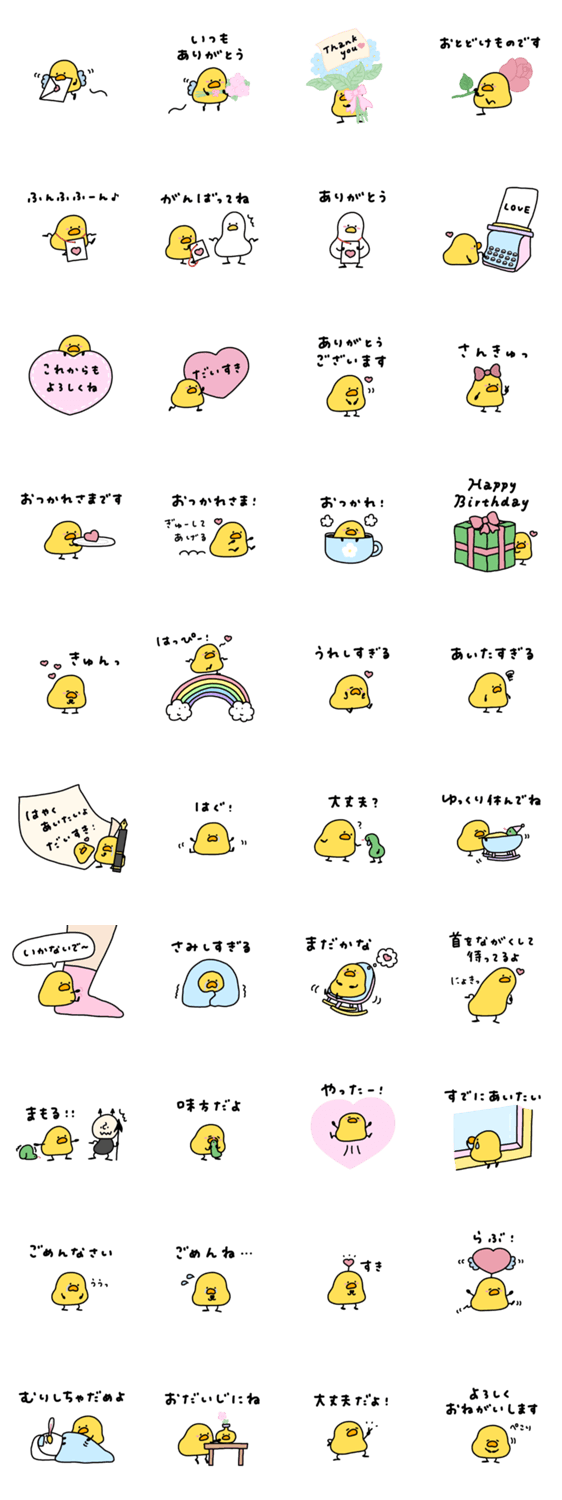 ヘンテコなひよこの気持ちを伝えるスタンプだよ! アヒルもちょっとだけ登場! 好きな人たちにたくさん送ってね☺︎
