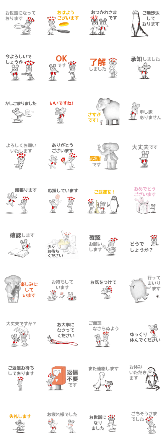 | スタンプ説明 | 名作絵本「ねずみくんのチョッキ」より、おしごと中にとっても使いやすい敬語のスタンプです♪もちろん普段使いにも最適です♪ |