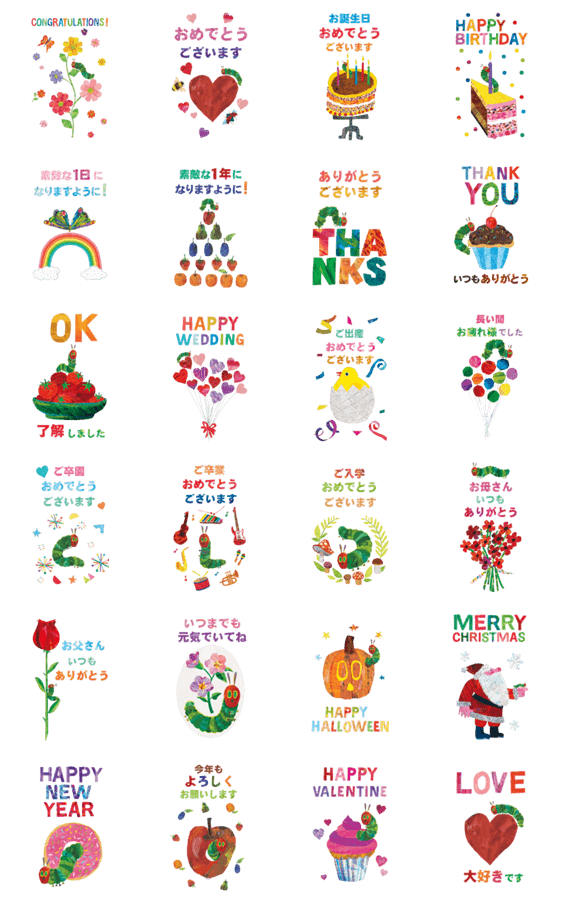 | スタンプ説明 | 世界中で愛されている絵本「はらぺこあおむし」よりず〜っと使える!定番!グリーティング☆BIGスタンプが登場♪ ※このスタンプはトークルームで大きく表示されるBIGスタンプです。 |