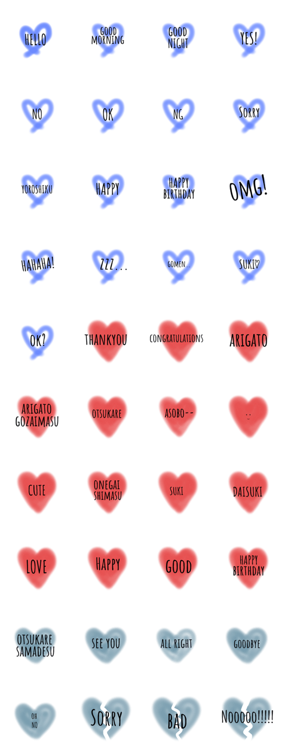 スタンプ説明 淡いハートに使いやすい日常ワードを。