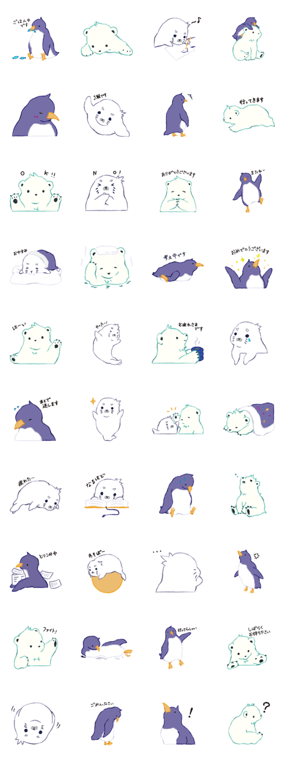 寒冷地に住むくせ毛の動物たちの、ほんわかスタンプ。ペンギンとしろくまとアザラシ。