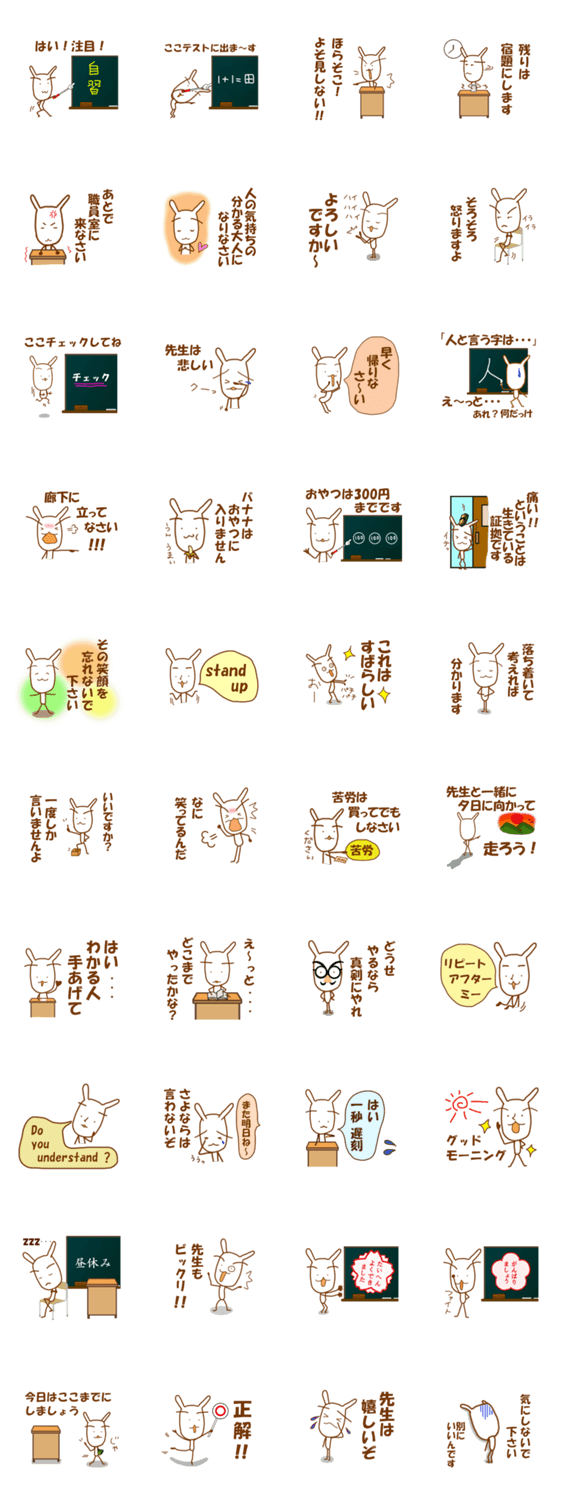うさぎの「ひげなし先生」です。学校で先生がよく使うセリフをスタンプにしました。みんなが先生気分になれてトークを楽しくするためのスタンプです。