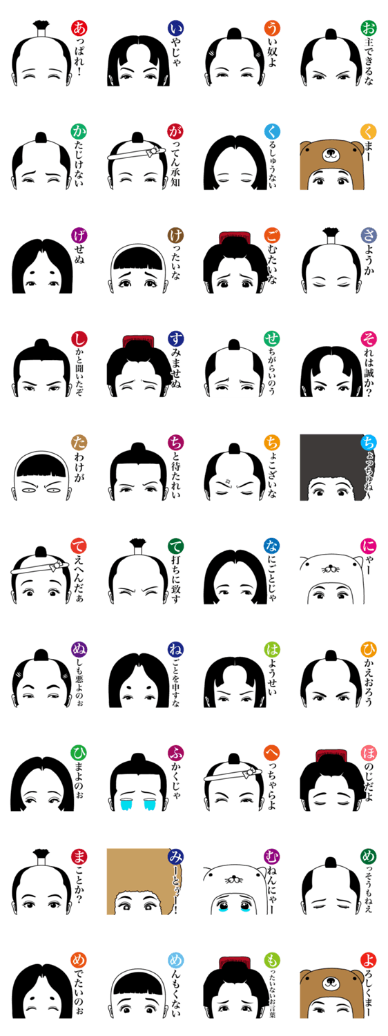 | スタンプ説明 | づらをかぶった女子が、ほぼ時代劇風に目で語るスタンプにございます。五十音順でセリフも探しやすいでござる。 |