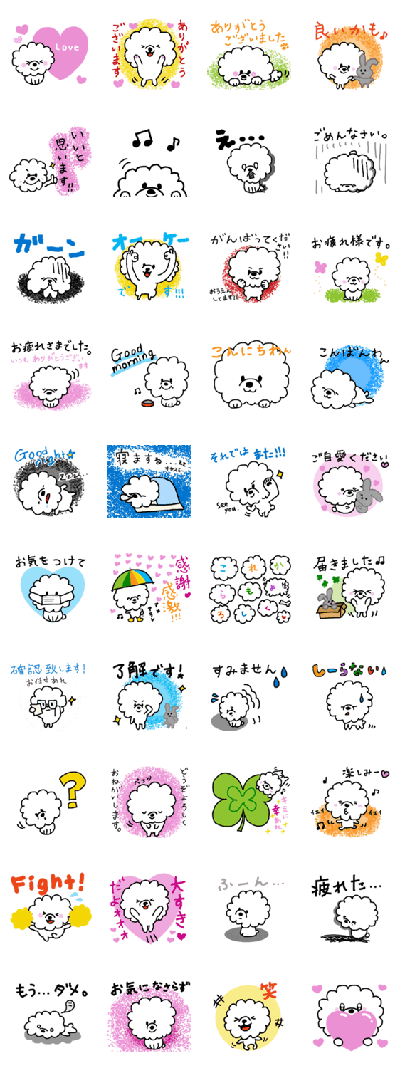 小さくてまん丸・ふわふわのビションフリーゼが可愛くあなたの気持ちを伝えます。丁寧に気持ちを伝えたい方にもお勧めのスタンプです。