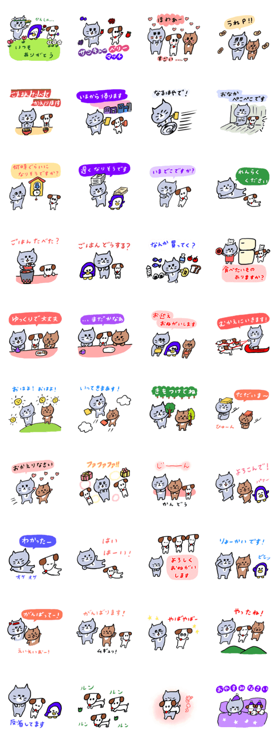 「ごはんたべた?」や「何時くらいになりそうですか?」など、家族に使いやすい表現を集めたスタンプです。日頃の感謝もかわいく伝えます。