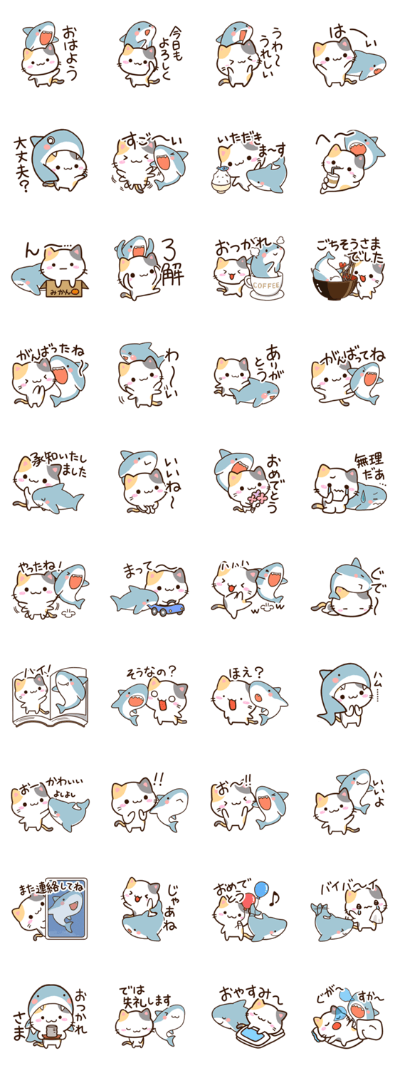 『小さい三毛猫』と、ちびサメが、かわいく返信します。毎日よく使う言葉から、簡単に反応できるものまで、便利なミケネコと、ちいさい鮫のスタンプです。【かたこ】