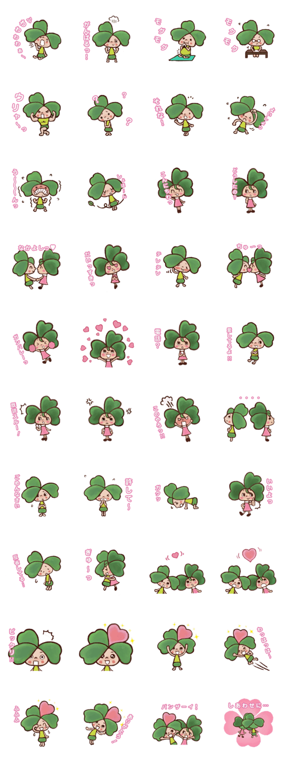 | スタンプ説明 | 三つ葉のクローバーのみっちゃんが、いろんな事に挑戦して恋をして、はたして四つ葉になれるのか…あなたを幸せにもしちゃうかも。 たくさんの幸せが訪れますように。 |