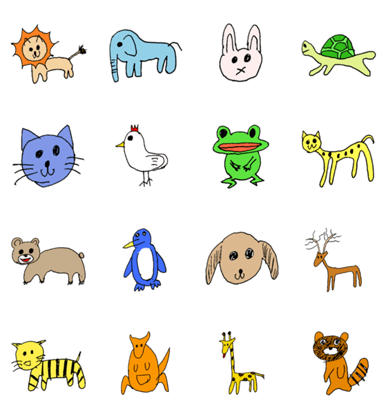 ヘタかわな動物たちです。ライオン、ゾウ、ウサギ、カメ、ネコ、トリ、カエル、チーター、クマ、ペンギン、イヌ、シカ、トラ、カンガルー、キリン、レッサーパンダ