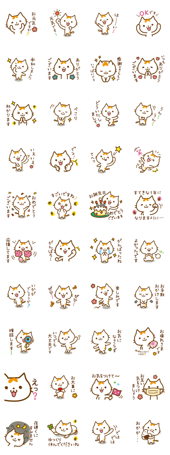 ゆる~いネコ「もっち」の会話に便利なスタンプ第3弾。会話に便利なゆるい敬語のあいさつがいっぱい!