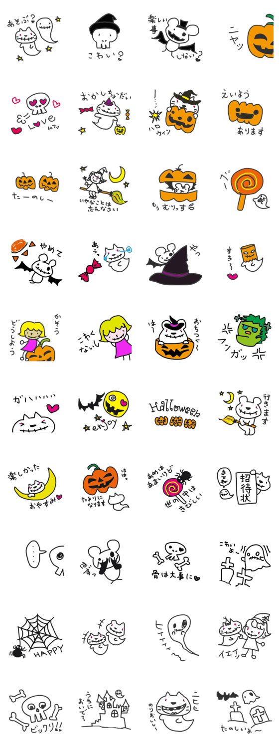 | スタンプ説明 | ゆるくかわいいねこ、くま、おばけ、魔女、骸骨、かぼちゃで楽しいハロウィンに。普段使いでも。 |