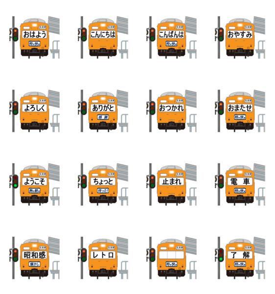 動く鉄道のスタンプです。赤信号により駅で列車が停車します。