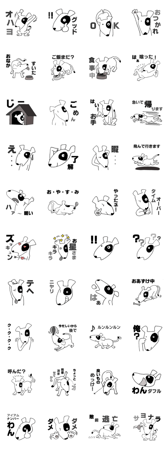 いたずら好きなブルテリアのスタンプです。日常の連絡に便利です。