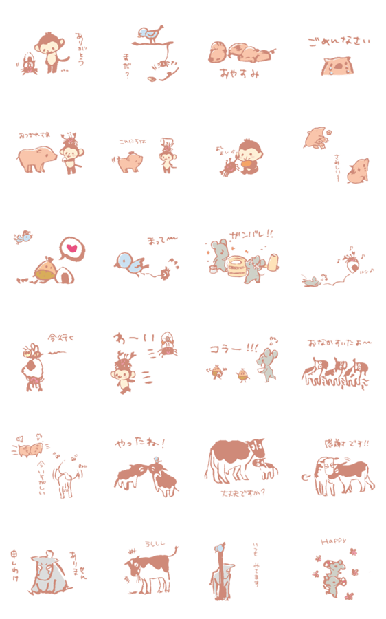 いろんな生き物+栗のスタンプ おにぎりに恋する栗や蜘蛛と仲良しの鳥、子供のさるの面倒を見ているカニなどいます。