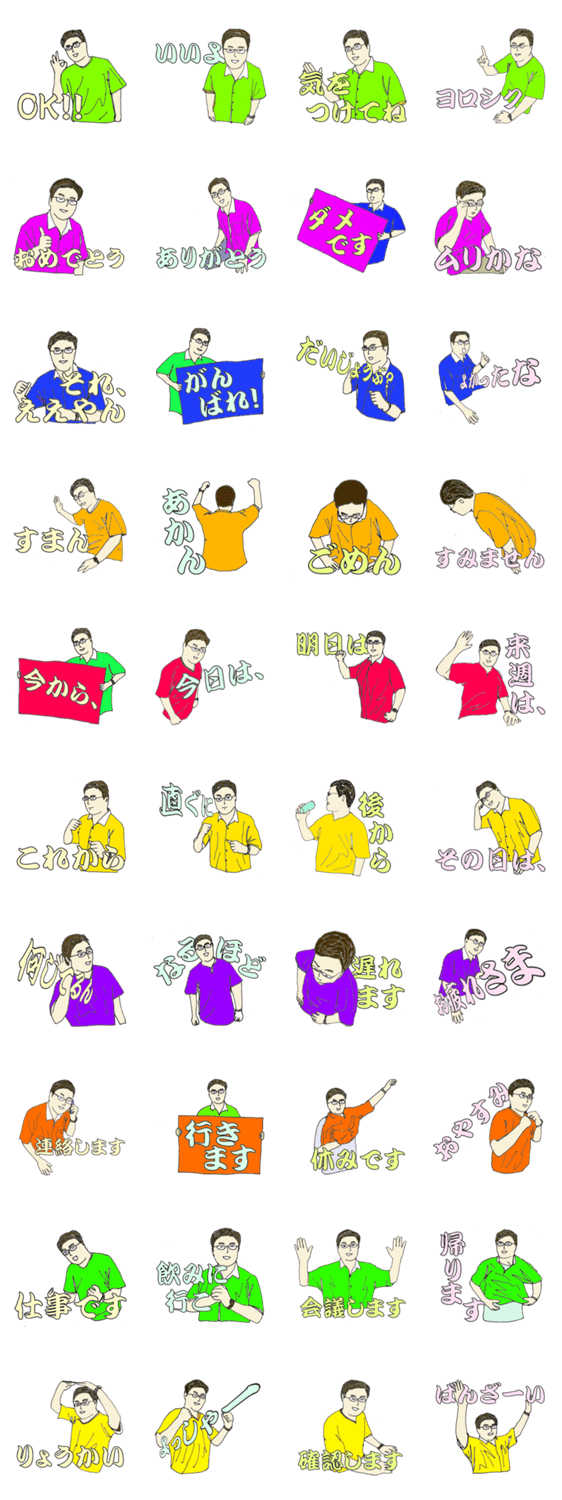 | スタンプ説明 | 介護の仕事では『社内の情報共有』が最も重要になります。そこで、『情報』を瞬時に送信出来る様に、服を10色にしました。TPOに合わせて事業所内での連絡にご活用下さい。 |