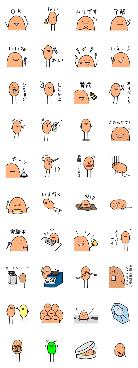大腸菌E.コリくんの日常や研究室で使えるスタンプです。理系大学生の方、微生物を扱うバイオ・生命科学関係の方におすすめ。