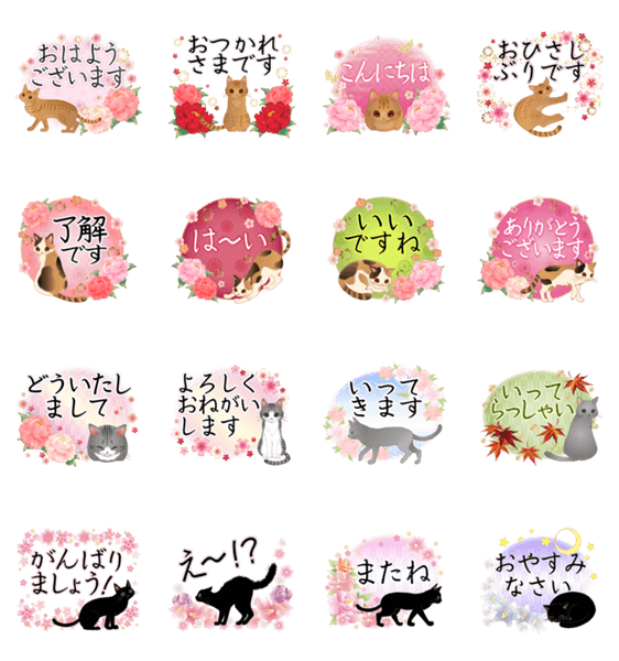 三毛猫や黒猫、牡丹や桜など和風なテイストが大人可愛いポップアップスタンプです!あいさつや日常会話など毎日使えて便利です♪