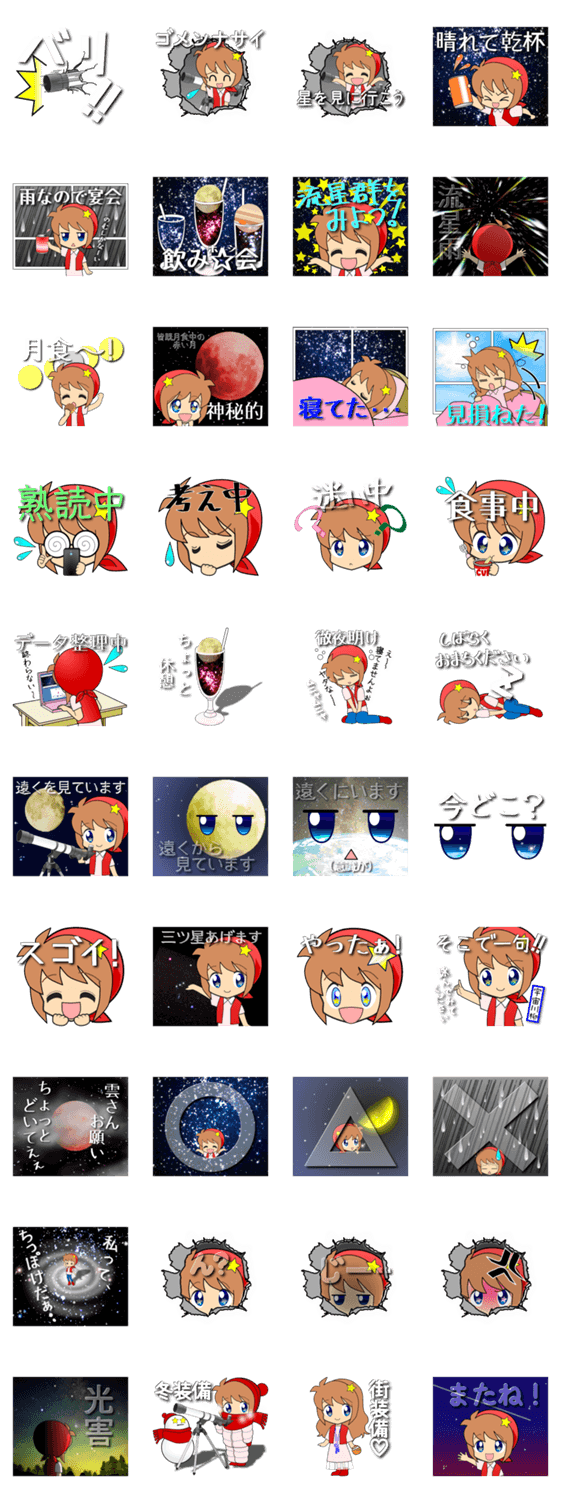 スターウォッチング大好き「星見ちゃん」スタンプ第二弾です。天文ファンのあるある(?)をスタンプにしました。