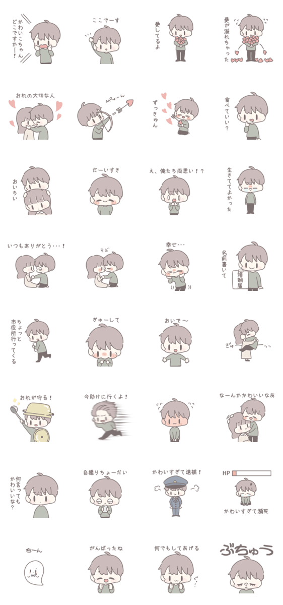 カップルや夫婦向けの、彼女を愛でて褒めるスタンプです。関連用語:同棲/彼氏/男の子/推し/溺愛/夫/彼女/応援/かわいい/恋人/好き